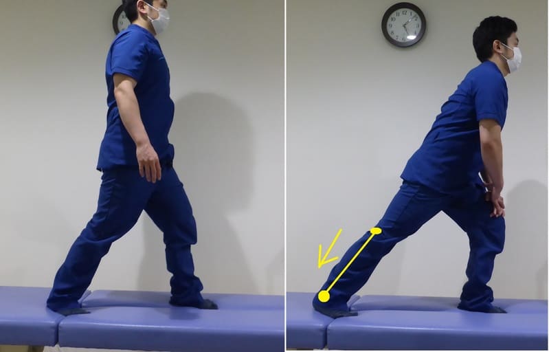 足を前後にまっすぐにして立ち、息を吐きながらゆっくりと前に出した足を曲げながら、前に体重をかけましょう。この時に後ろ足のかかとが地面から浮かないようにしましょう。呼吸をしながら後ろのふくらはぎにストレッチを感じたら20秒キープしてゆっくり元の位置に戻します。続いて反対側も同じように行いましょう。