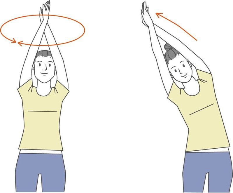 脚は肩幅に開き、鼻から息を吸いながら腕をクロスさせた状態で、できるだけ肘を伸ばします。息をゆっくり吐きながら横に倒していきます。ゆっくり元の状態に戻し同じように反対側も行います。これを1分繰り返します。