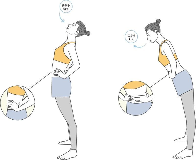 脚を肩幅に広げ両手で肋骨の下あたりをつかみます。つかんだわき腹をもみながら3秒かけて鼻から息を吸いながら背中をそらします。3秒かけて口から息を吐きながらお腹を絞ります。元の姿勢に戻りこれを1分間行います。