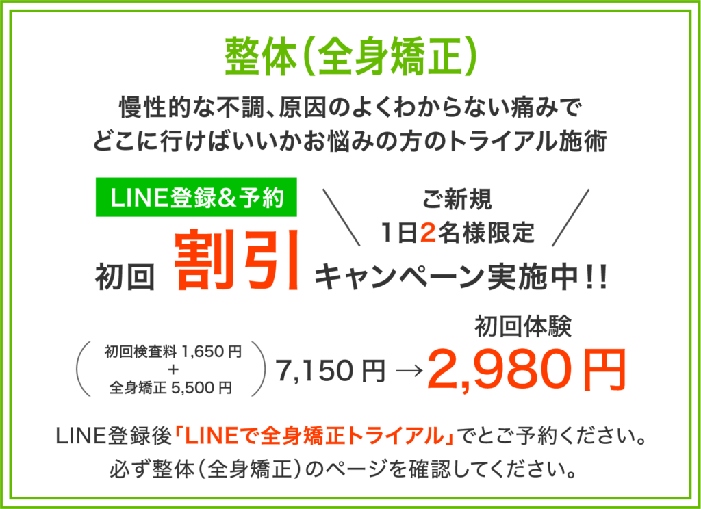 1日2名様限定でLINEで全身矯正トライアルでと予約された方のみ適用になります。